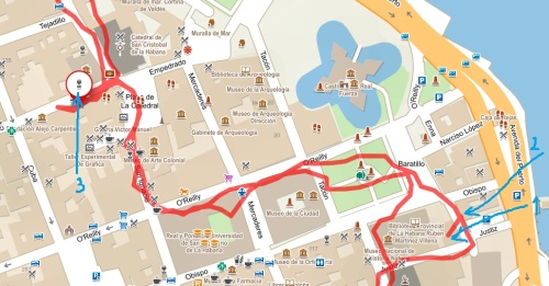 Po projížďce jsme autobusem dojeli do Nové Havany na oběd. Bylo kuře s rýží. Autobus nás vzal pak nazpátek do Staré Havany, kde jsme měli krátkodobý rozchod. Chvilku jsme jen tak bloumali, až nás odchytla nějaká bába a zavlekla nás do krámku s doutníky a lihovinami. Samozřejmě si řekla o dvě eura za doprovod. Bylo tu levněji než na pevnosti v krámku. Pojda něco koupil, mě se nechtělo nic tahat. Naproti krámku /2/ byl pěkný venkovní bazárek /1/. Měl jsem za úkol koupit nějakou magnetku a ty jsem tu objevil. Ovšem kubánec chtěl za ně 3éčka, což se mi za balzovou počmáranou destičku a na ní přilepené dva magnety, zdálo moc. A za Cheguevaru chtěl víc. Vedle trhovec, co prodával odznaky, byl u nás, takže uměl česky, tímž jsem ho využil jako translátor. Začal jsem smlouvat, několikrát jsem magnetky vrátil a schoval peníze i jsem ho zkusil škrtit, což nakonec zabralo. Bohužel mě tlačil čas, takže jsem za 5 éček resp.cuců, protože éčka nechtěl, koupil tři magnetky. No, ve Varaderu byly magnetky za euro dvě, ale zase nebyly tak pěkné. Kluci na mě čekali a na zbytek volného času jsme se přesunuli ještě jednou do baru Bodeguita del medio /3/, kde si dával Mojito Hemingway.